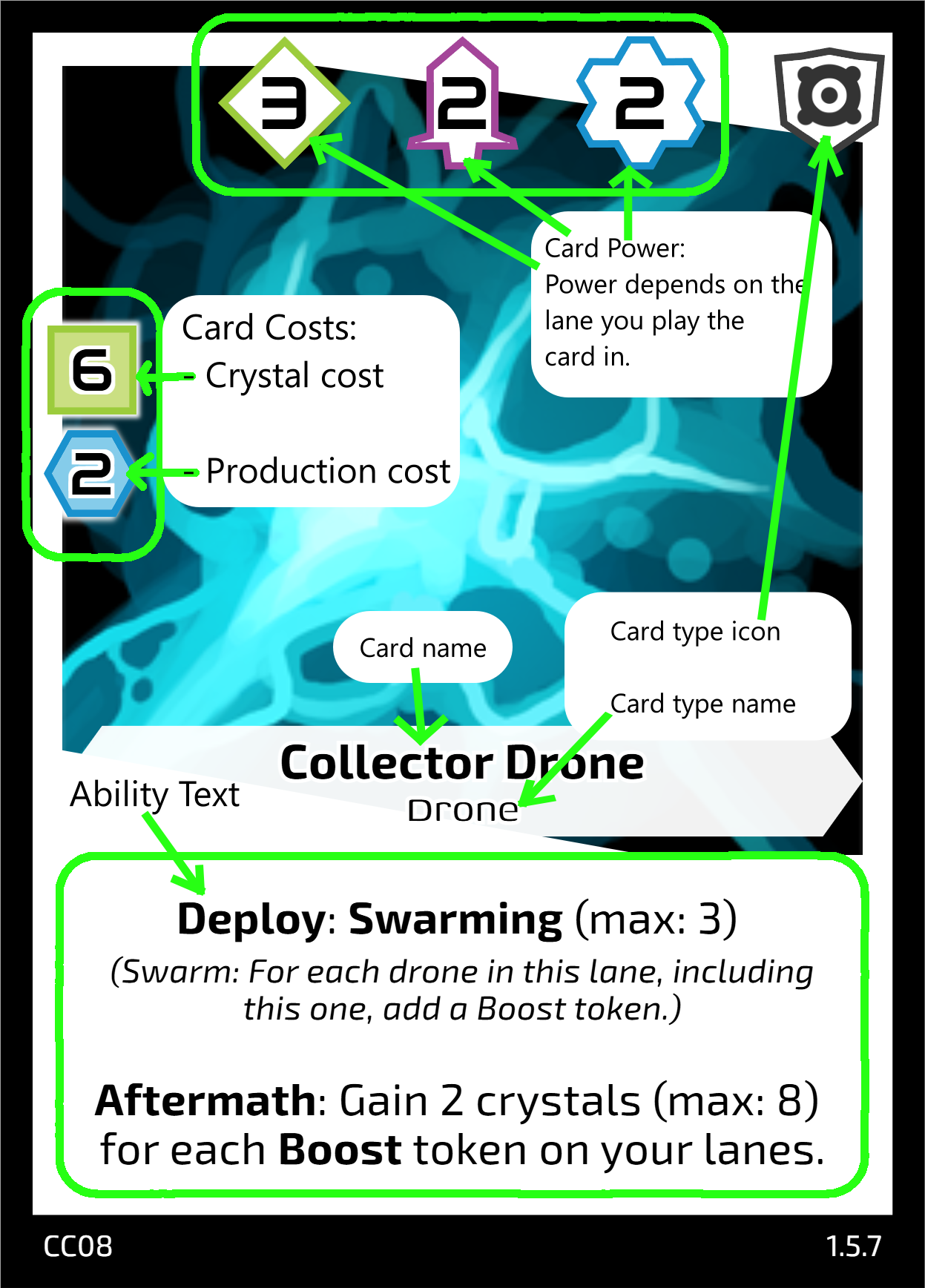 Cards consist of 3 main areas, the card values, the cost, and the abilities.